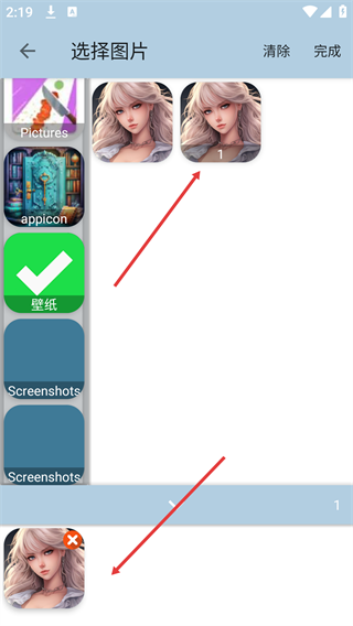 3、进入图片选择界面后,从相应文件夹(例如Pictures文件夹)里选定想要的图片,若需调整已选内容可点击“清除”按钮,确认选择无误后即可进入视频编辑阶段。
