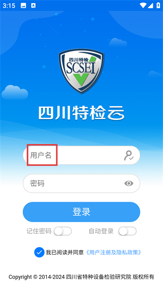 1、在【四川特检云】的登录界面中,找到【用户名】输入框,然后输入相应的用户名信息。