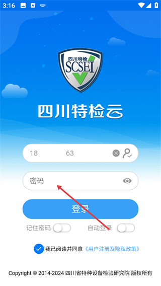 2、在【四川特检云】的登录页面里,找到【密码】输入框,然后准确输入该账号所对应的密码。