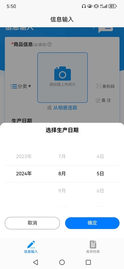 3、回到信息录入页面后,用户能够通过上传照片、从相册中选择图片、扫描条形码等多种途径来录入物品的相关信息。