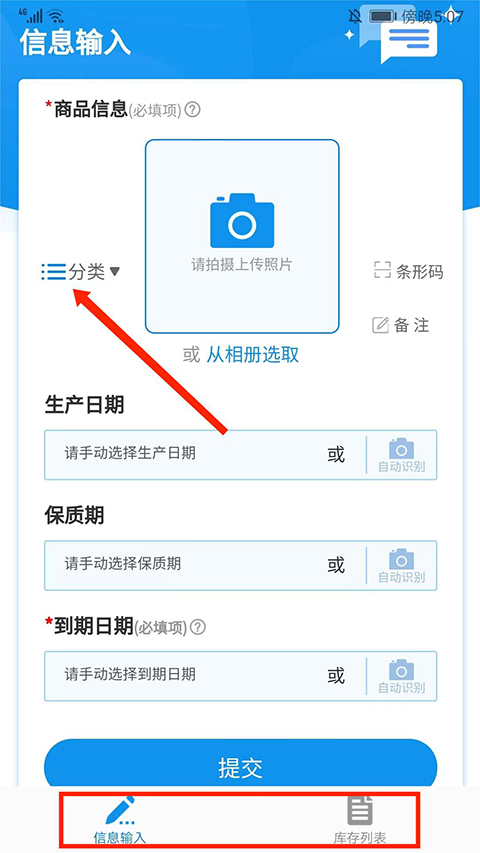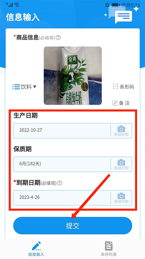 5、用户既可以手动输入物品的生产日期、保质期、到期日期等信息,也可以通过拍照的方式自动识别这些内容。