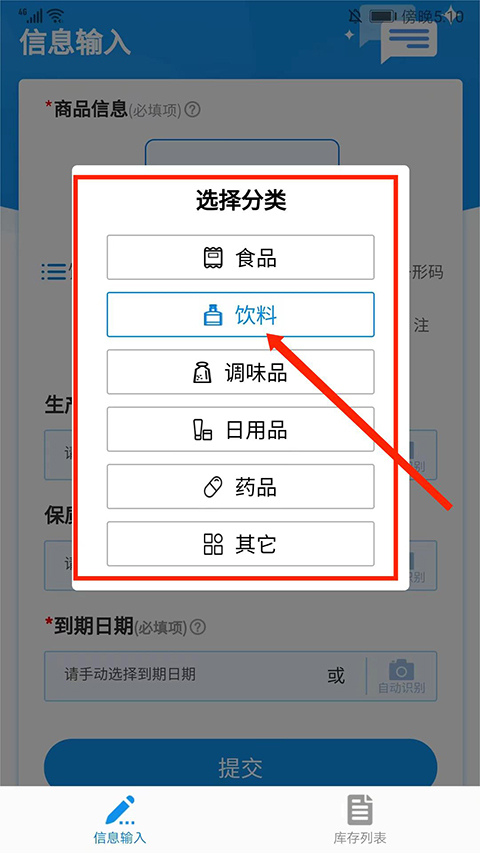 2、用户可以为需要录入的物品挑选不同的分类,这里以“饮料”作为示例,点击该分类即可。