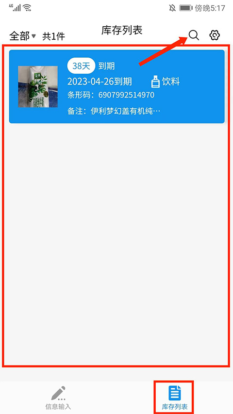 7、用户保存的物品信息都会存入“库存列表”板块,若要快速查找所需物品,用户可点击右上角的放大镜图标进行搜索。