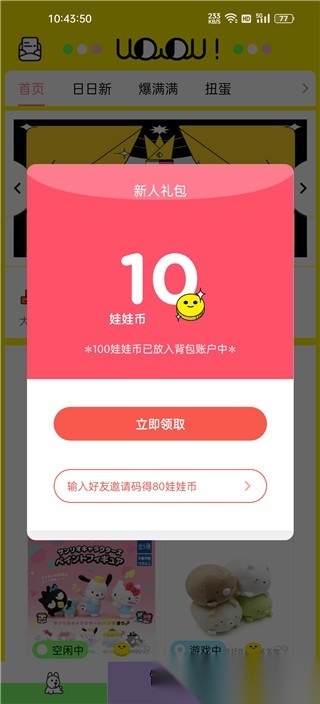 2.输入邀请码之后,用户还可以领取娃娃金币奖励。