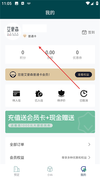 进入【我的】页面后,你可以查看【普通卡】会员的相关信息,包括积分和余额情况;同时也能看到不同状态的订单,比如【待入住】和【已入住】的订单;另外,会员权益也可以在这里进行查看。
