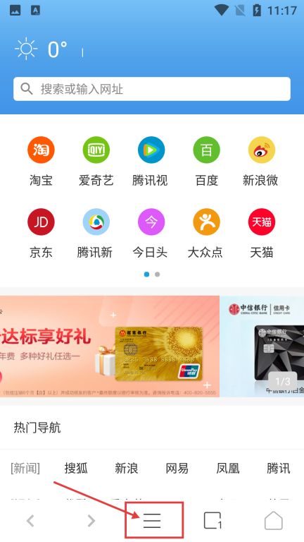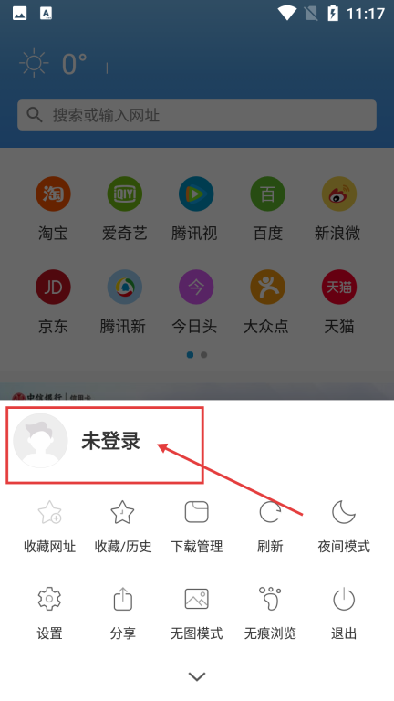 1、在浏览器主界面,点击底部的三条横线菜单按钮,能展开功能菜单,以便进行登录等操作。