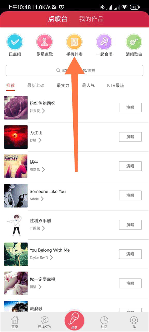 2、然后在点歌台界面的顶部点击手机伴奏。