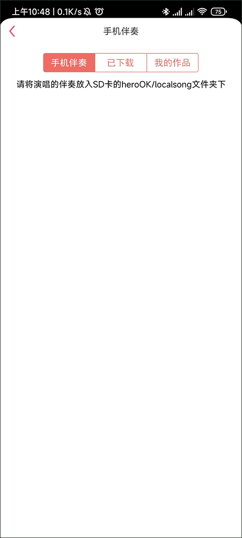 3、此时我们尚未将伴奏上传至软件中,进入手机的伴奏界面后会看到提示,要求我们把文件放入指定文件夹,这时只需前往手机的文件管理中进行移动操作即可。