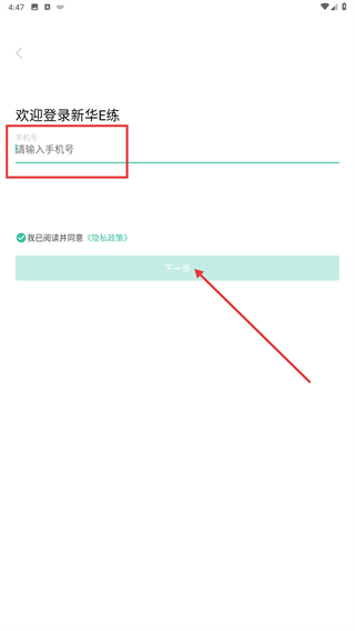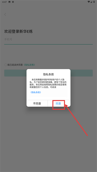 1、进入【新华E练】的登录页面后,先阅读弹出的《隐私条款》,接着点击【同意】按钮,就能完成隐私政策同意选项的勾选操作。