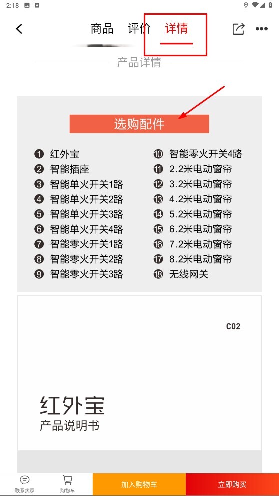 4、点击【详情-标签】,查看“选购配件”列表与产品说明书。