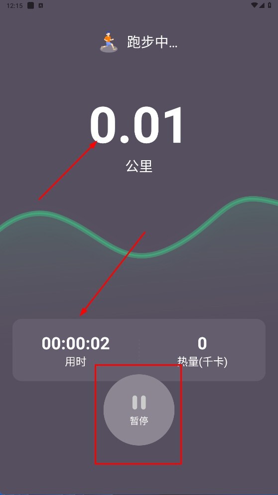 3、运动过程中,能够查看实时的里程、用时以及热量消耗情况,点击【暂停】按钮即可临时中止运动。