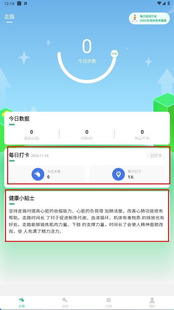 1、进入“步数”页面后,能够查看当日步数、里程、消耗热量等相关数据,进行每日打卡活动,也可以阅读健康小贴士来知晓走路带来的好处。