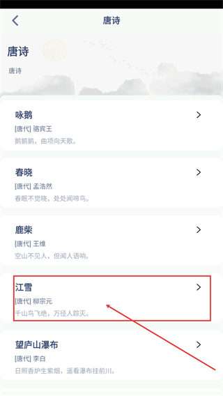 2、在唐诗列表页面,找到想要查看的诗作(比如《江雪》)并点击它,就能进入这首诗的详情页。