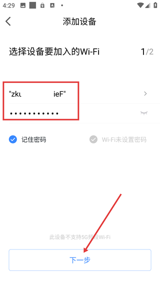 3、进入添加设备页面后,选择设备拟加入的Wi-Fi网络,输入对应的密码,随后点击【下一步】按钮。
