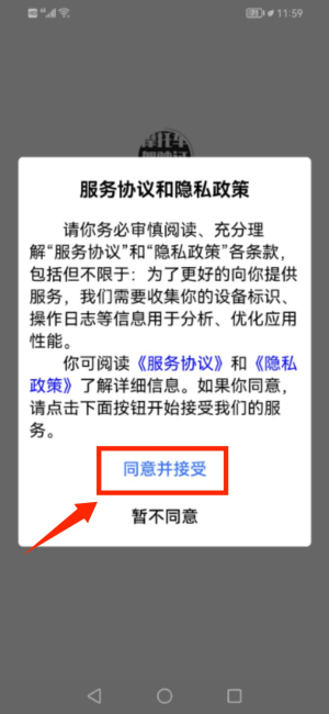 1、应用首次启动时,请在弹出的服务协议窗口中点击同意并接受。