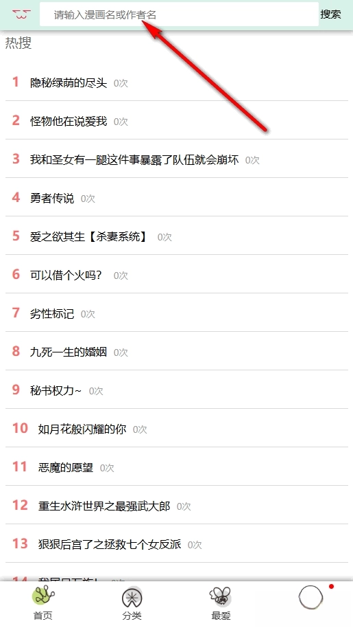 你可以输入漫画名称或者作者名字,然后点击【搜索】按钮;也可以直接点击热搜榜单上的漫画。
