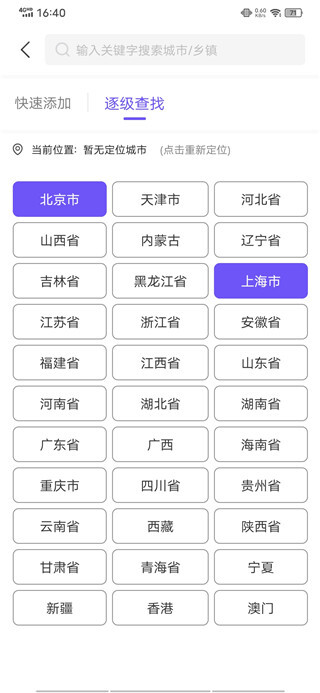 3、进入后,用户可选择开启定位功能,让系统自动定位你所在的城市,也能手动输入地区进行添加。