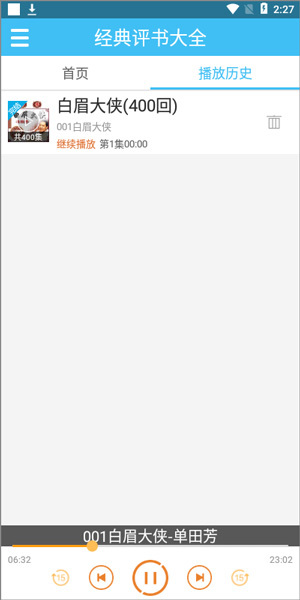 3、可自动保存播放后的历史记录,依托多项实用功能,让您连续听评书轻松无忧、一劳永逸。