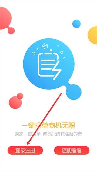 1、在引导页看到“一键抢单商机无限”的提示后,点击【登录注册】按钮,即可进入登录相关页面。