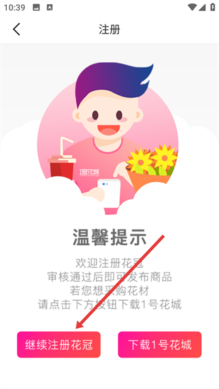 3、在注册的温馨提示页面,点击【继续注册花冠】按钮,即可进入注册信息填写页面。