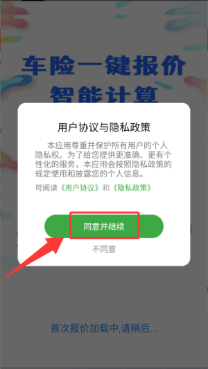 1、启动车险相关的应用程序,当出现用户协议和隐私政策的弹窗时,点击“同意并继续”按钮。