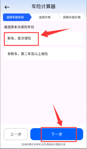 3、进入车险计算器页面后,先选择“新车,首次保险”这一选项,接着点击“下一步”按钮。