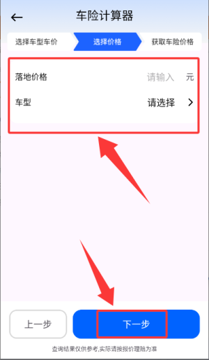 4、接下来输入车辆落地价并选定车型,随后点击“下一步”按钮,继续开展后续操作。