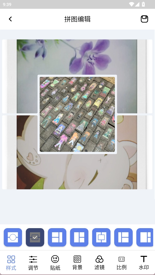 3、底部有多种布局样式可以选择,还有贴纸、滤镜等功能