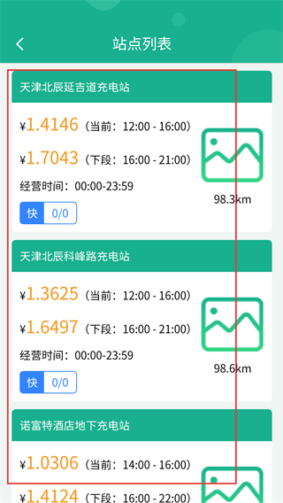 4、在【站点列表】页面中,能够查看各个充电站的时段价格、经营时间以及距离信息,例如【天津北辰延吉道充电站】的收费标准这类内容。