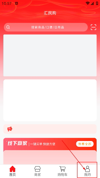 1、打开【汇民购】首页后,能借助搜索栏查找【商品/口罩/日用品】,点击底部的【我的】选项即可进入个人页面。