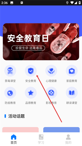 1、在首页找到并点击【安全教育】的功能入口,即可进入安全教育课程的分类列表页面。
