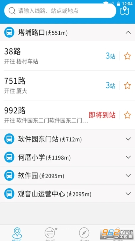 附近站点,途径线路实时到站。查询页面