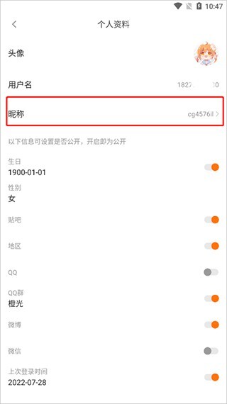 4、进入个人资料界面后,点击页面中的昵称菜单;