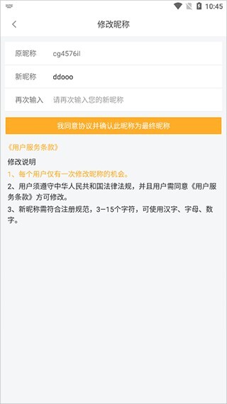 5、进入修改昵称的界面后,输入新昵称,勾选同意协议,即可完成昵称修改;
