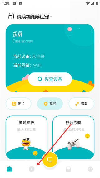 1、进入投屏主页面后,点击底部的功能按钮即可切换至播放器界面,在此过程中还能开展投屏设备搜索以及图片、视频、音频的分类操作。