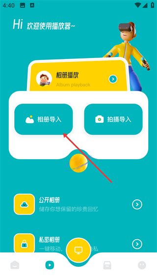 2、进入播放器页面后,点击【相册导入】选项,即可进入本地相册的内容选择界面(也可选择“拍摄导入”的方式)。