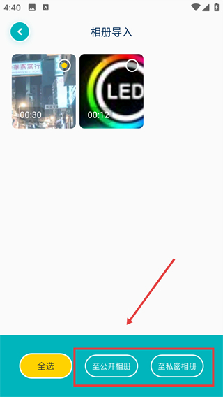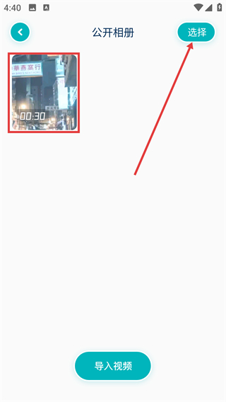 4、进入公开相册页面,选中需要进行操作的内容,点击右上角的【选择】按钮,接着点击【导入视频】,即可完成内容导入的流程。