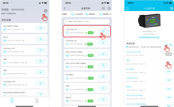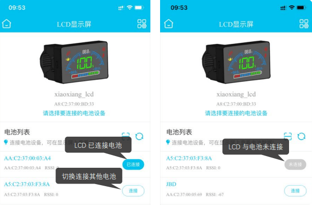 若要切换连接其他电池,只需在电池列表里选中目标电池,点击“连接”按钮,就能完成切换操作。 STEP5:连接成功后,可在LCD屏幕上查看电池的基本数据。
