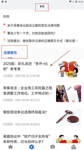 3、进入“发现”页面后找到“法律资讯”分类并切换过去,挑选其他主题的资讯内容(例如《2025版:彩礼返还“条件+比例”参考表》),然后点击进入对应的详情页面。