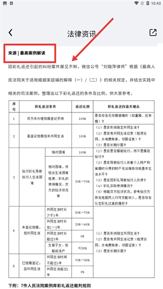 4、在彩礼返还资讯页面,可查看依据最高人民法院案例梳理的返还条件、比例及自查要点,并参考司法实践中的裁判规则。