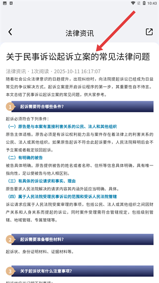 2、进入资讯详情页面后,用户能够查看起诉条件、所需材料、起诉状注意事项等法律相关内容,从而获取与诉讼有关的指引信息。