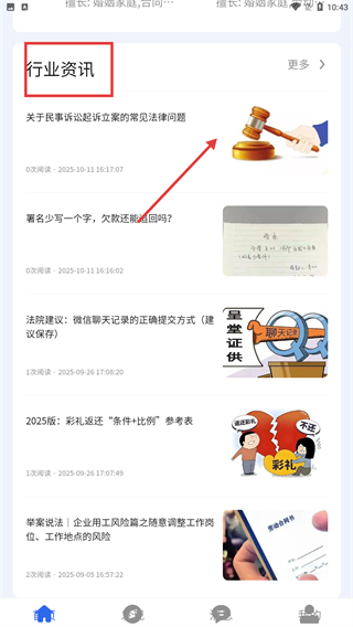 1、打开应用后,找到“行业资讯”板块,挑选想要查看的法律资讯(例如《关于民事诉讼起诉立案的常见法律问题》),点击该资讯进入详情页面。
