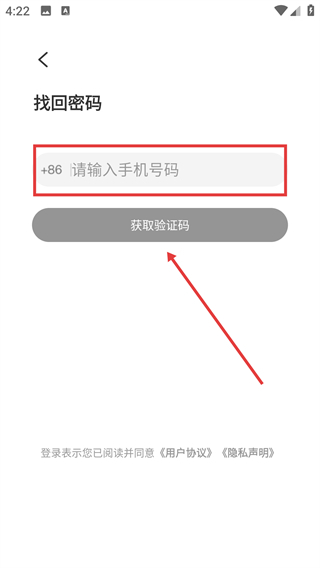 4、进入【找回密码】页面后,首先在【+86-请输入手机号码】的输入框中填写对应的手机号,接着点击【获取验证码】按钮以推进后续流程。