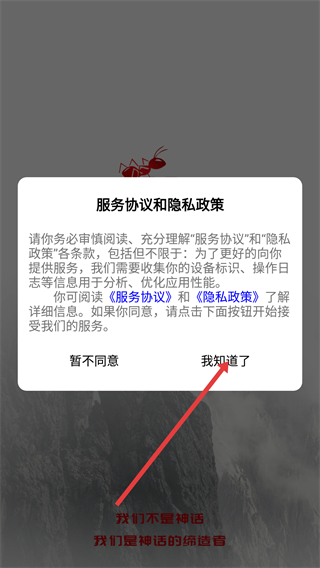 1、打开应用后会弹出【服务协议和隐私政策】的提示,在阅读完相关条款后,点击【我知道了】按钮即可进入应用。