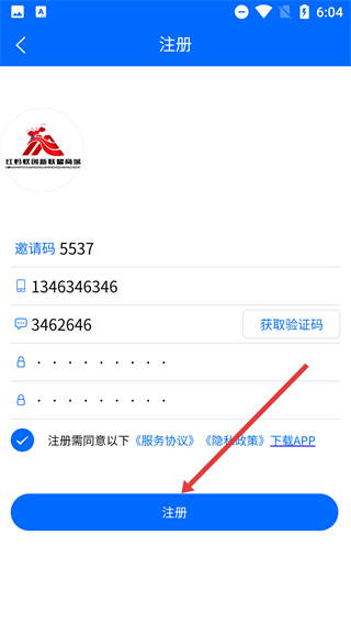 4、进入注册页面后,依次填写【邀请码】、【手机号】,接着获取并填写【验证码】,再设置【密码】,勾选相关协议后点击【注册】按钮,即可完成账号注册流程。