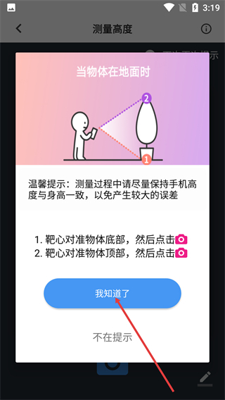 2、进入测量高度的提示页面后,先仔细阅读操作指引,接着点击【我知道了】按钮,即可进入后续的配置环节。