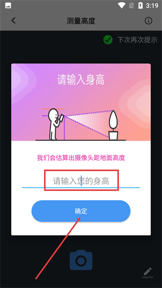 3、进入身高输入页面后,先填写自己的身高信息,再点击【确定】按钮,这样就完成了测量前的参数配置。
