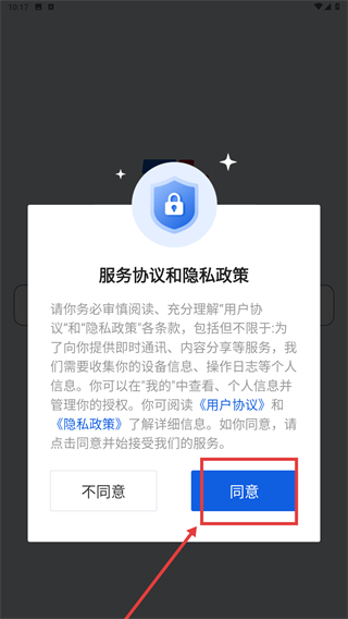 1、当出现【服务协议和隐私政策】的弹窗时,点击其中的【同意】按钮,以此确认接受相关条款,随后即可进入应用的使用流程。