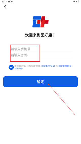 3、进入登录信息页面后,在【请输入手机号】和【请输入密码】栏填写对应信息,勾选相关协议,然后点击【确定】按钮,即可完成登录流程。