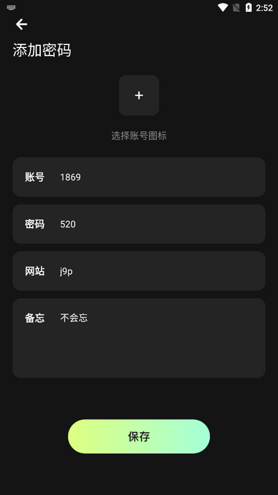 1、添加密码功能:用户能够输入账号、密码、对应的网站以及备忘信息,以此来对相关账号密码进行添加和管理。